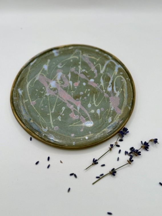 Ręcznie wykonany mały talerzyk deserowy powstał metodą toczenia na kole garncarskim. Każdy egzemplarz jest unikatowy — subtelne różnice w kształcie i detalu podkreślają jego rękodzielniczy charakter.